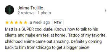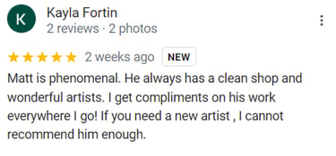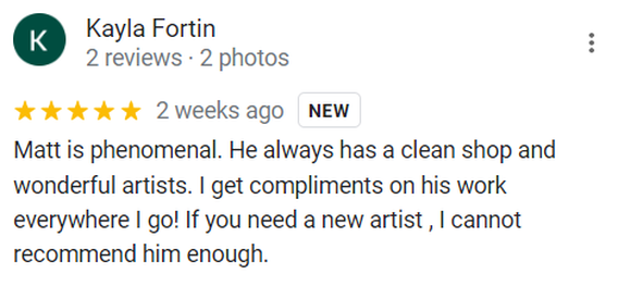 "Followed Matt from his other shop due to his abilities, professionalism and honesty on what works and what may not turn out how you’d like. I definitely appreciate that. Got to have another tattoo done by him today at the new shop which is a nice clean, easy to locate space with the same great service. Highly recommend." - Nicole S.